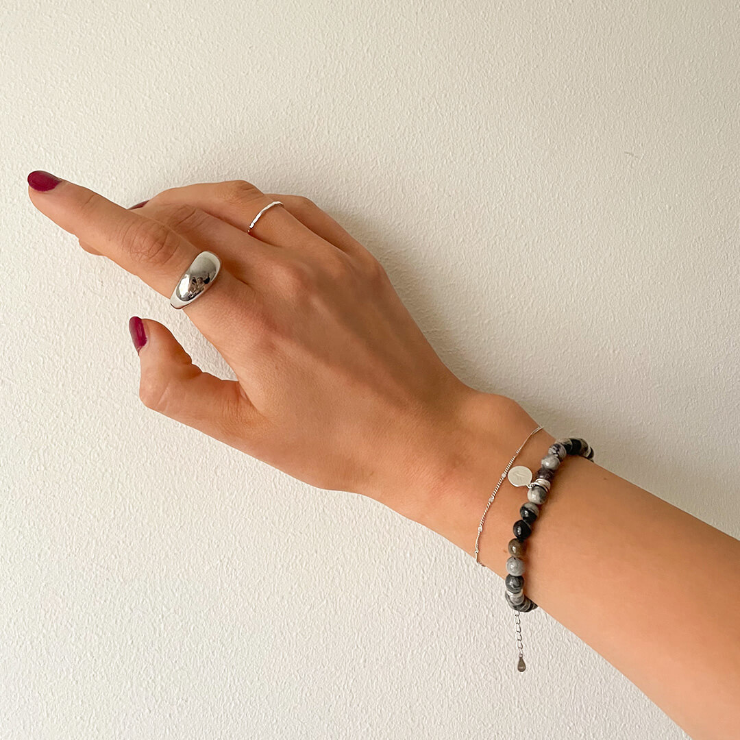 Aeris Bracelet är ett stilrent armband i Silver Leaf Jaspis från det svenska designmärket Livingstone Wikh Accessories. Armbandet förenar naturlig elegans med balanserad design och skapades för dig som vill bära något med mening. Varje sten har ett unikt mönster i svart, grått, silvervitt och ibland med varma inslag av brunt eller rosa. Kombinationen speglar naturens egna kontraster och nyanser.