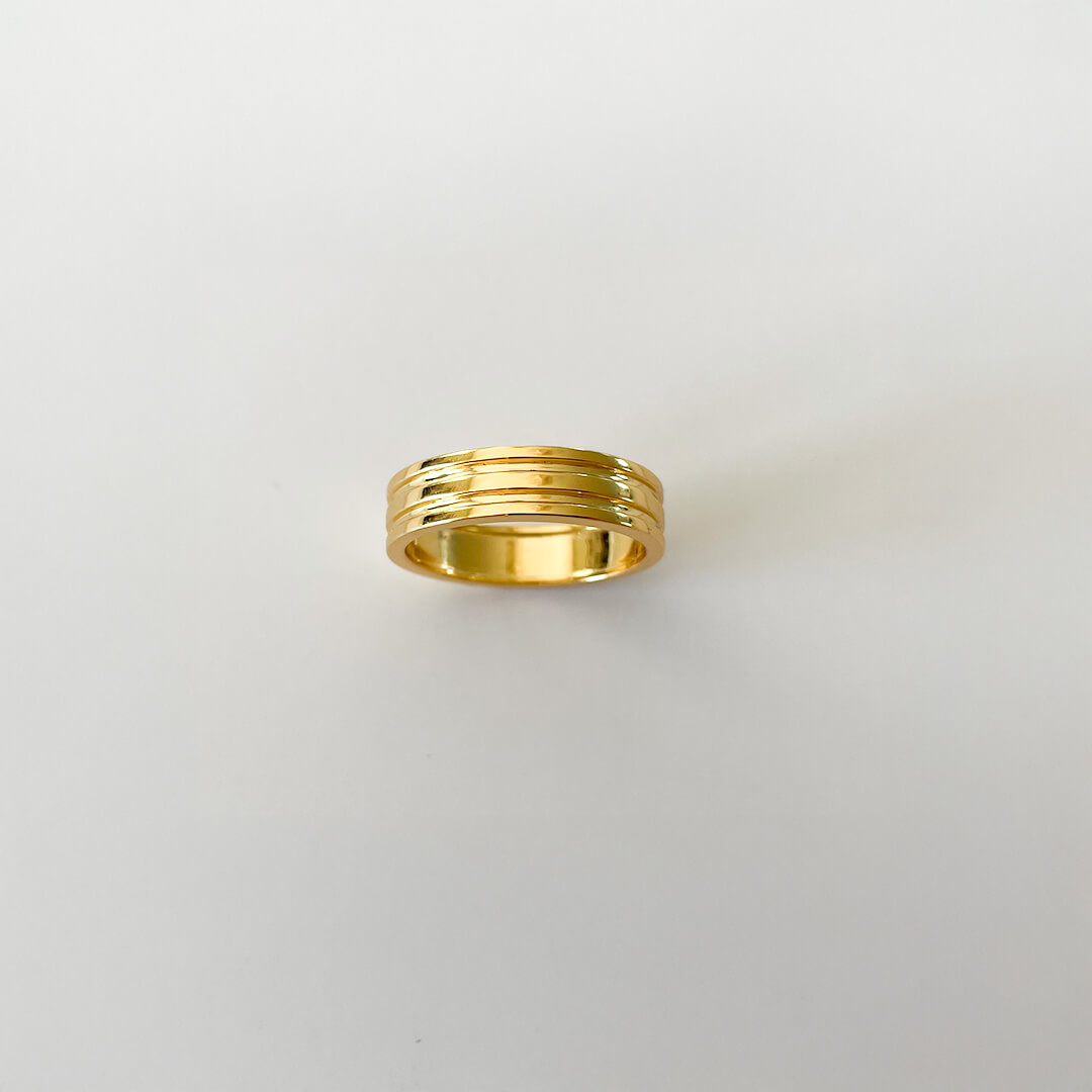 Med sina dubbla ränder får ringen ett grafiskt uttryck som ger djup och variation. Ytan fångar ljuset på ett sätt som framhäver både den blanka guldfinishen och de finstämda linjerna. Resultatet är en ring med ett avskalat formspråk och samtidigt en tydlig identitet.