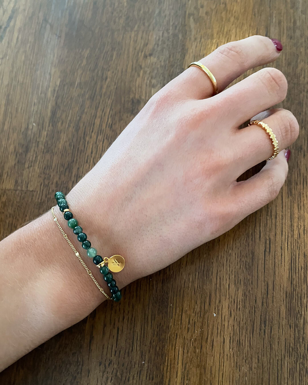 Moss Bracelet är ett stilrent armband i Mossagat från ett svenskt designmärke. Det är skapat för dig som vill bära ett smycke med både naturlig känsla och personlig betydelse. Pärlorna består av äkta Mossagat med mjuka gröna toner och organiska mönster. Därför får varje armband ett helt unikt uttryck. De noggrant utformade metalldelarna i 925 sterling silver med 18K guldplätering ger dessutom en varm och modern finish.