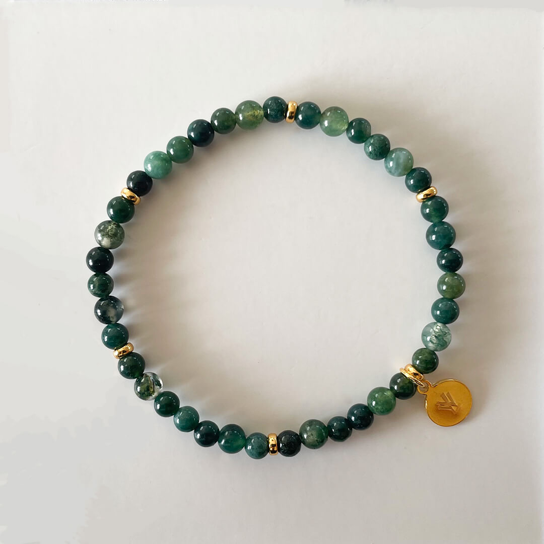Mossagat är en sten som ofta förknippas med balans och lugn. Den sägs skapa stabilitet och hjälpa bäraren att hitta närvaro i vardagen. Därför blir stenen ett fint val för dig som vill känna mer harmoni. Färgskiftningarna påminner samtidigt om naturens strukturer, vilket gör designen både levande och tidlös.