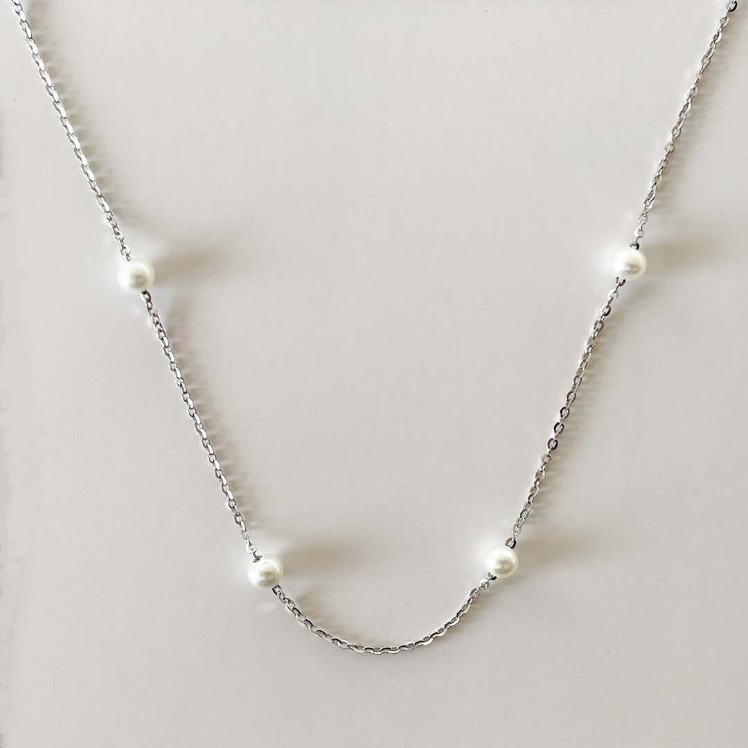 Pearl Necklace, Silver är ett stilrent halsband i platinapläterad 925 sterling silver med noggrant utvalda sötvattenspärlor. Kombinationen av silvrets svala lyster och pärlornas mjuka glans skapar en klassisk och tidlös design – ett smycke som förenar tradition och modernitet.